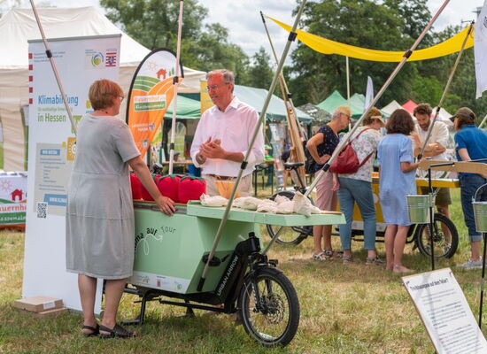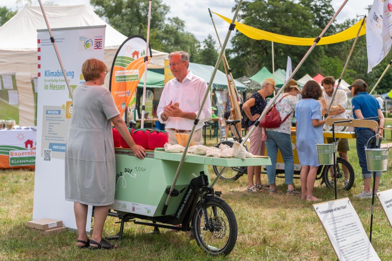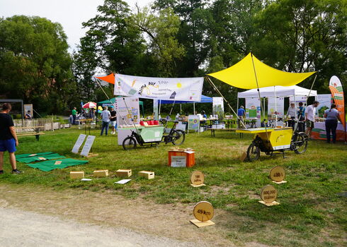 Diesen Fragen und noch vielen mehr geht die Wanderausstellung Klima auf Tour nach. Mobil und anschaulich zugleich wurden Pop-up-Stände auf der technischen Basis von Lastenrädern realisiert. Ihr auffallendes und originelles Erscheinungsbild weckt Interesse, sich mit den Möglichkeiten zum Handeln im Klimaschutz auseinanderzusetzen. So reiht sich ein Angebot von Energieberatung zur Wärmedämmung an eine Experimentierstation zu Solarenergie von Bildungsakteuren. Eine Probierstation klimafreundlicher Köstlichkeiten folgt dem Upcycling alter T-Shirts. Klima auf Tour trägt damit Erfahrung und Wissen zum Klimaschutz in die Mitte der Gesellschaft.