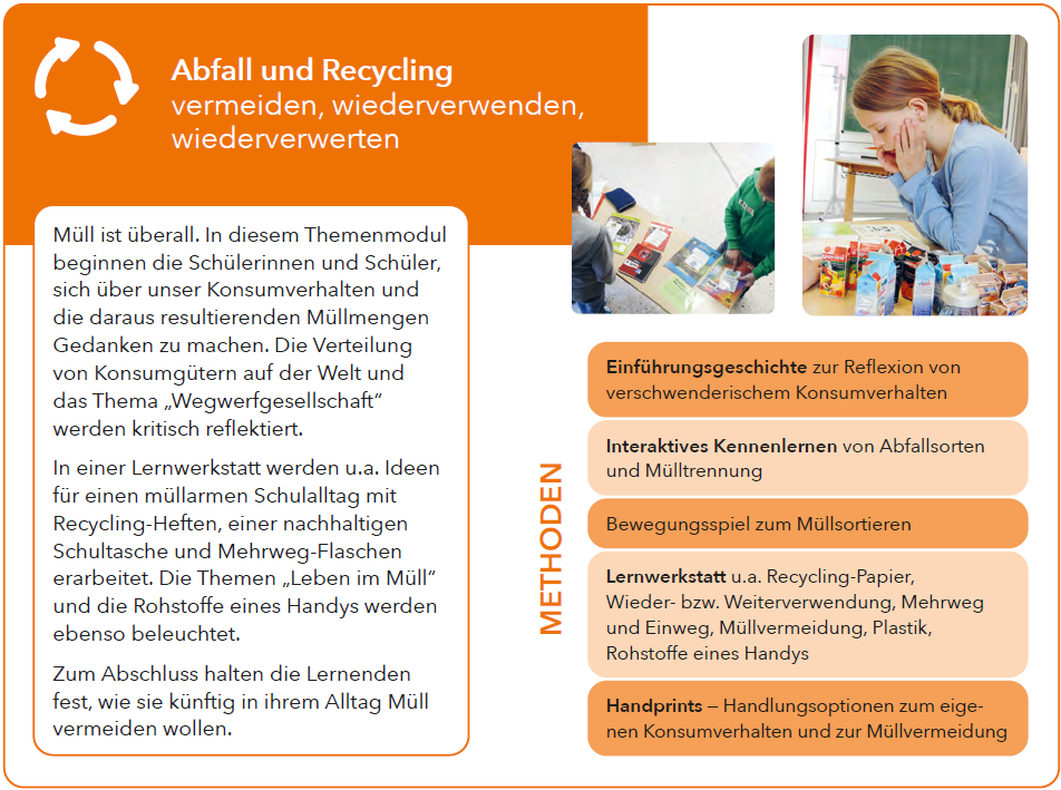 Müll ist überall. In diesem Themenmodul beginnen die Schülerinnen und Schüler, sich über unser Konsumverhalten und die daraus resultierenden Müllmengen Gedanken zu machen. Die Verteilung von Konsumgütern auf der Welt und das Thema „Wegwerfgesellschaft“ werden kritisch reflektiert.