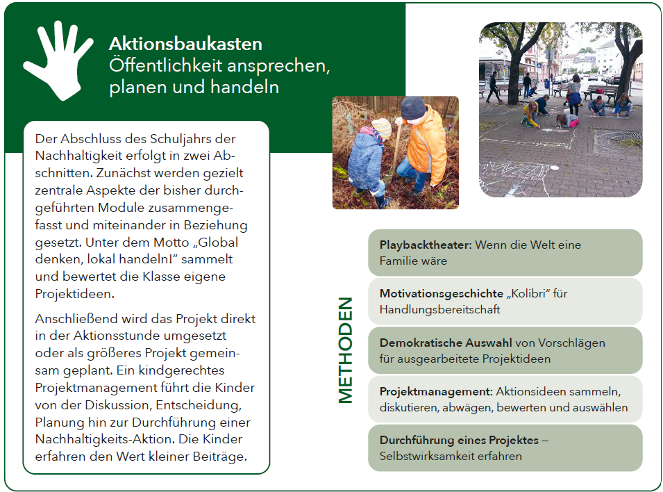 In allen Modulen werden die Themen einer nachhaltigen Entwicklung mit kindgerechten und handlungsorientierten Methoden umgesetzt. Der rote Faden „Globale Gerechtigkeit“ wird mit der Weltkugel und den Lebenssituationen von Kindern in anderen Ländern veranschaulicht. Mit der Methode Handprint entwickeln die Kinder am Ende jedes Moduls Handlungsoptionen und können Selbstwirksamkeit erfahren. Die begleitenden Materialien bestehen aus reich bebilderten Arbeitsblättern, Hintergrundinformationen und Durchführungsabläufen. Sie können heruntergeladen und auf den Lernstand der Kinder angepasst werden. Mit Alltagsmaterialien können die Lernstationen leicht selbst hergestellt werden. Zusätzlich stehen bei elf Umweltbildungszentren in Hessen Materialkisten zu den Themenmodulen zur Verfügung. Die Unterrichtseinheiten können von den Schulen auf die individuellen Bedürfnisse angepasst werden. Im Schulalltag können einzelne Methoden oder Arbeitsblätter genutzt, die Themenmodule auf mehrere Schulstunden verteilt oder in einer Projektwoche umgesetzt werden.