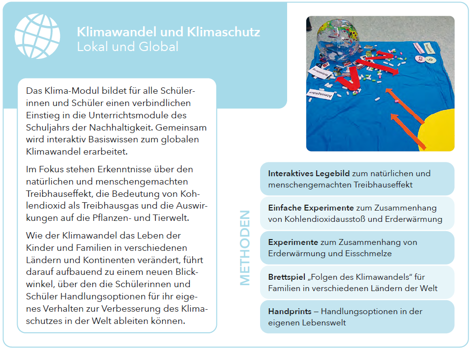 Das Klima-Modul bildet für alle Schülerinnen und Schüler einen verbindlichen Einstieg in die Unterrichtsmodule des Schuljahrs der Nachhaltigkeit. Gemeinsam wird interaktiv Basiswissen zum globalen Klimawandel erarbeitet.